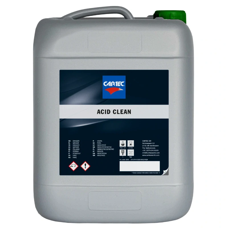 CARTEC Acid Clean 10 l je vysokoúčinný priemyselný kyslý čistič na odstránenie vodného kameňa, hrdze, ako aj náletovej hrdze. Produkt je penivý a je možné ho riediť v pomere 1:5. Aplikujte na zvolené miesto. Nechajte pôsobiť 1-2 minúty a následne opláchnite - najlepšie vysokotlakovým čističom.